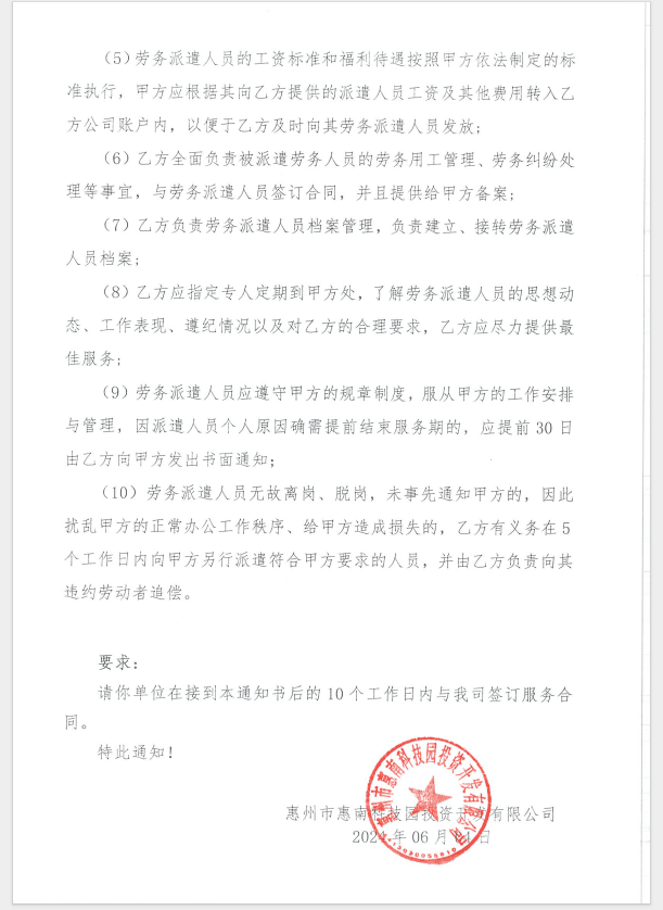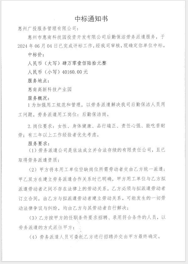 【中標(biāo)通知】惠州市惠南科技園投資開發(fā)有限公司后勤保潔勞務(wù)派遣服務(wù)