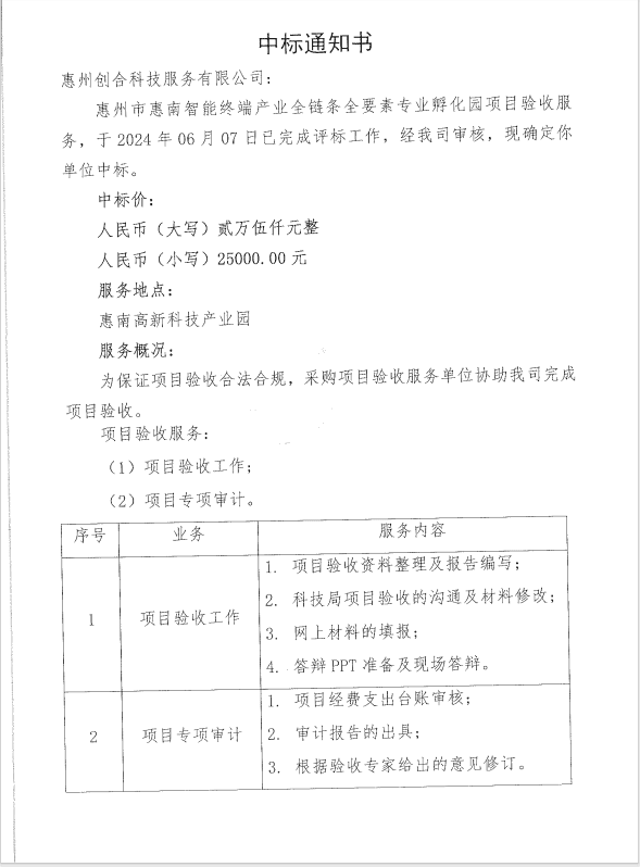 【中標通知】惠州市惠南智能終端產業(yè)全鏈條全要素專業(yè)孵化園項目驗收服務