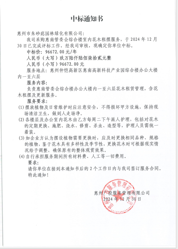 【中標(biāo)通知】采購(gòu)惠南管委會(huì)綜合樓室內(nèi)花木租擺服務(wù)