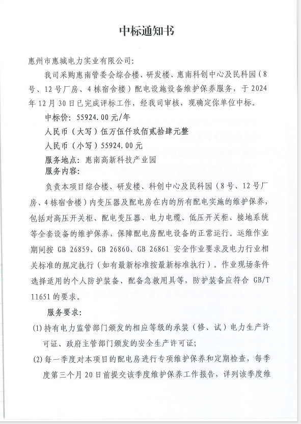 【中標通知】采購惠南管委會綜合樓、研發(fā)樓、惠南科創(chuàng)中心及民科園(8 號、12號廠房、4棟宿舍樓)配電設施設備維護保養(yǎng)服務