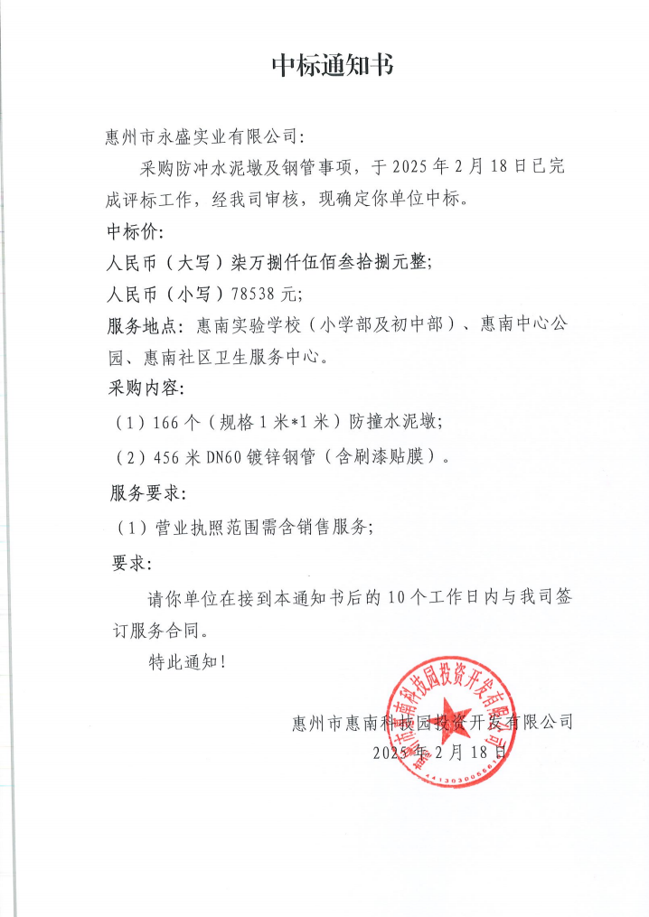 【中標(biāo)通知】采購防沖水泥墩及鋼管事項(xiàng)