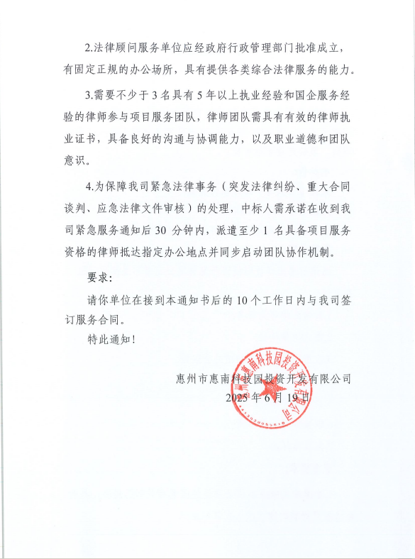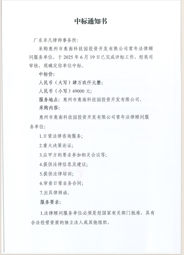 【中標(biāo)通知】惠州市惠南科技園投資開發(fā)有限公司常年法律顧問服務(wù)單位(二次)