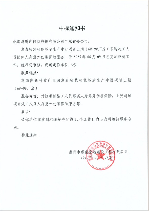【中標(biāo)通知】惠泰智慧智能顯示生產(chǎn)建設(shè)項目三期(6#-9#廠房)采購施工人 員團體人身意外傷害保險服務(wù)