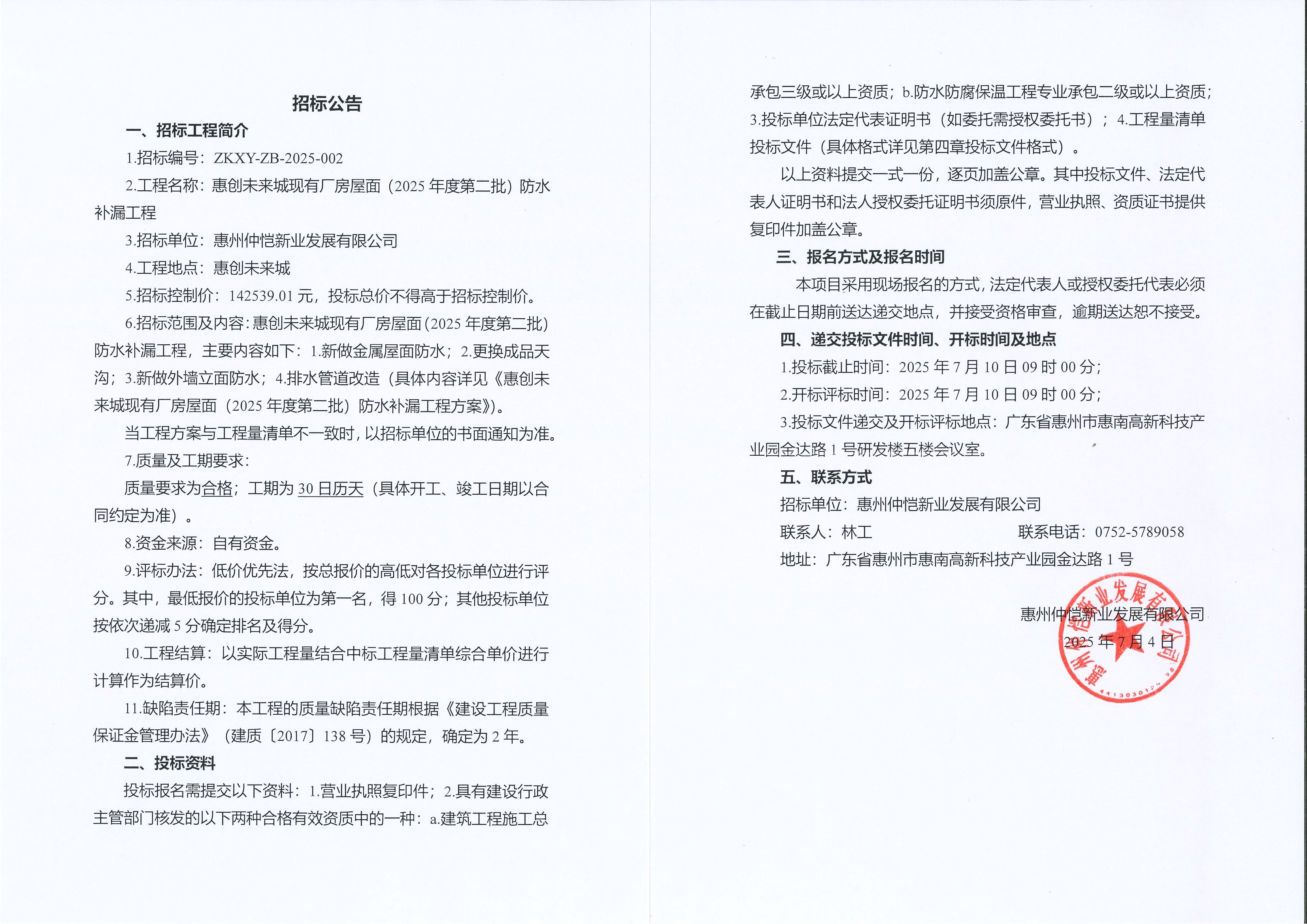 【招標(biāo)公告】惠創(chuàng)未來城現(xiàn)有廠房屋面(2025年度第二批)防水補(bǔ)漏工程