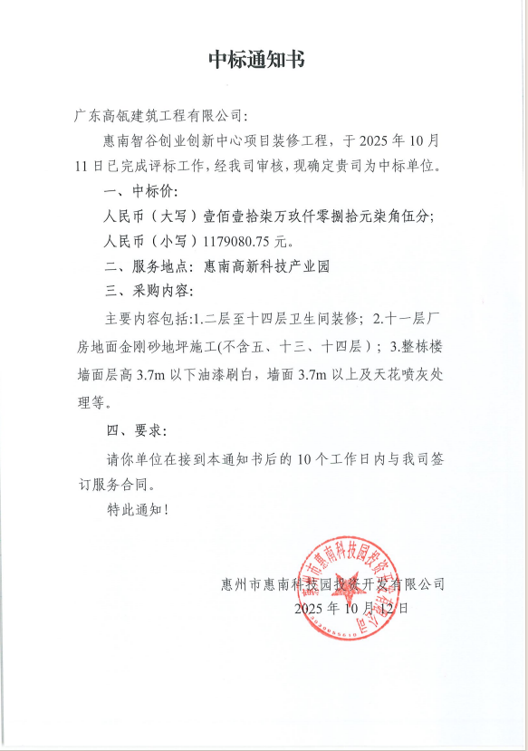 【中標(biāo)通知】惠南智谷創(chuàng)業(yè)創(chuàng)新中心項目裝修工程