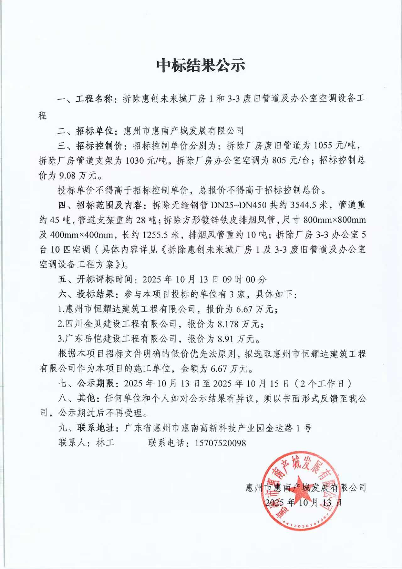 【中標(biāo)結(jié)果公示】拆除惠創(chuàng)未來(lái)城廠房1和3-3廢舊管道及辦公室空調(diào)設(shè)備工程