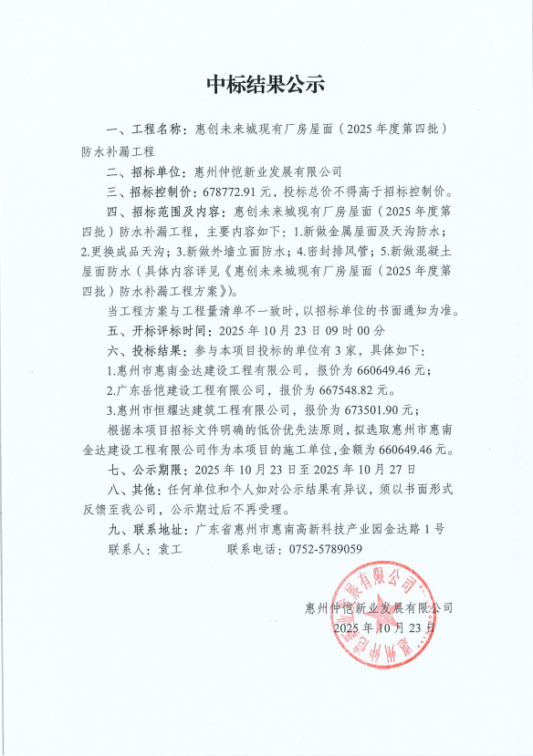 【中標(biāo)結(jié)果公示】惠創(chuàng)未來城現(xiàn)有廠房屋面(2025年度第四批)防水補漏工程