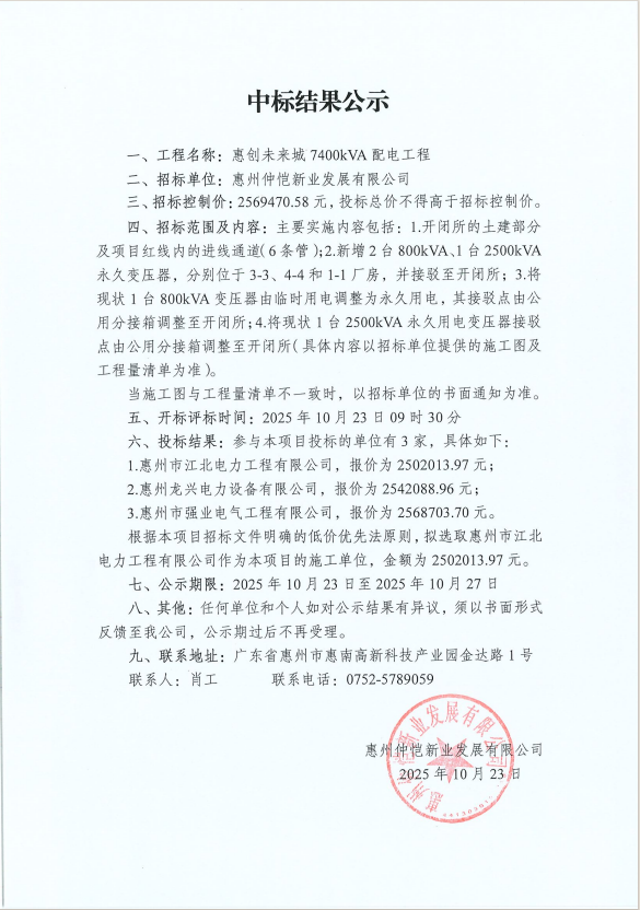 【中標(biāo)結(jié)果公示】惠創(chuàng)未來城7400kVA配電工程