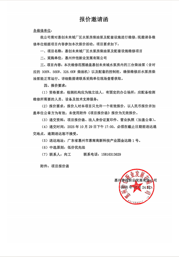 【報價邀請函】惠創(chuàng)未來城廠區(qū)水泵房柴油泵及配套設(shè)施維修項目